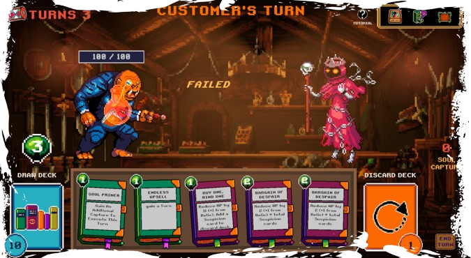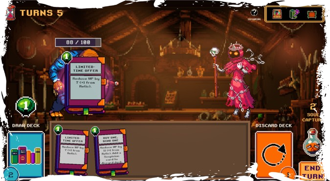 2d roguelike duel deck builder where you are a shop keeper trying to capture or defeat the souls of the customers in the least amount of turns possible, before the forces of good hunt you down. A game where turns are your most valuable resource